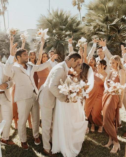 Bridesmaids can wear mismatched dresses in varying peach tones – from light apricot to dusty rose – for that eclectic boho look. Flowy maxi styles with floral crowns complete the ensemble. Grooms and groomsmen? Linen suits in beige or light gray, with peach ties or pocket squares. Suspenders and no jackets keep it casual and cool.