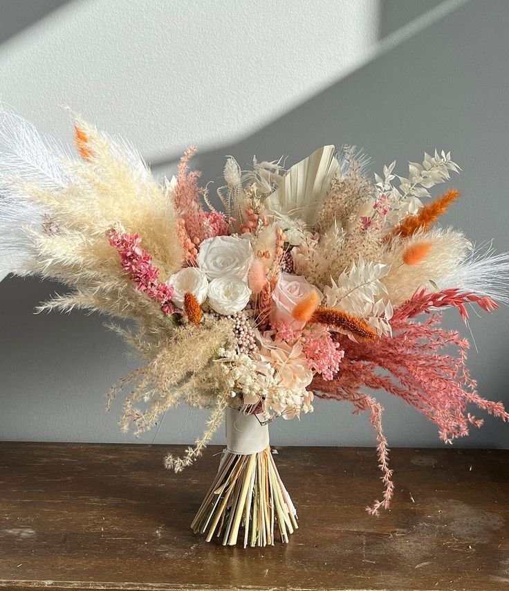 For lighting, string lights or lanterns hung from trees create a whimsical glow. Incorporate elements like feather details, woven baskets for favors, and signage with calligraphy in peach ink. Flowers play a huge role too – opt for wild blooms like peonies, ranunculus, and dahlias in peach shades, mixed with eucalyptus for that boho flair. Your bouquet could be oversized and asymmetrical, tied with a ribbon in a flowing fabric.